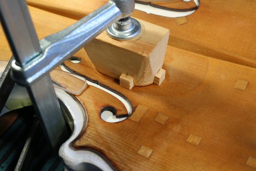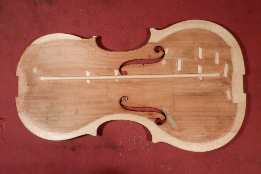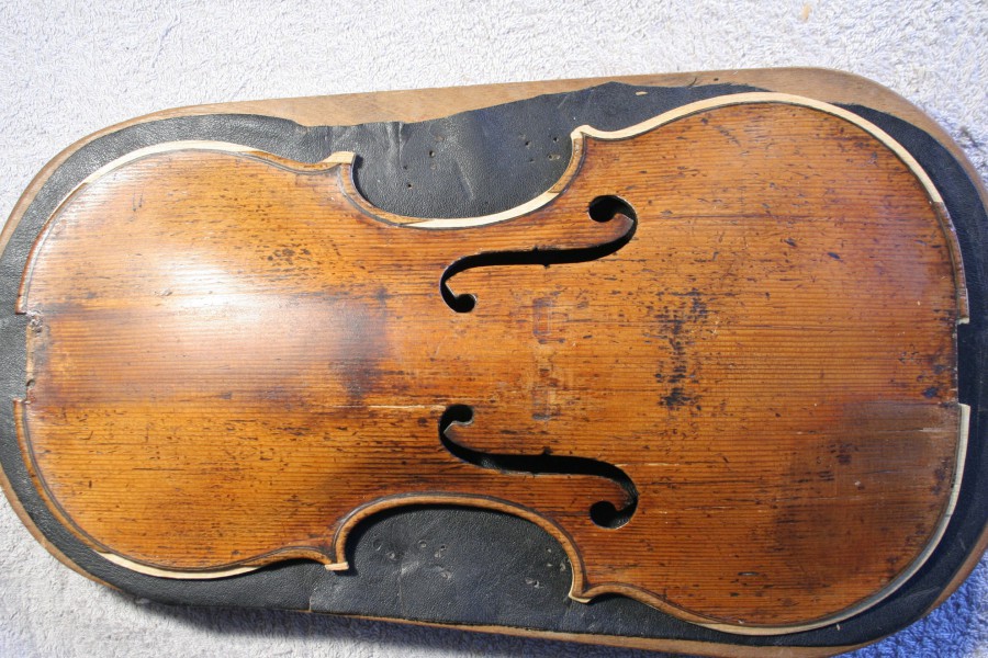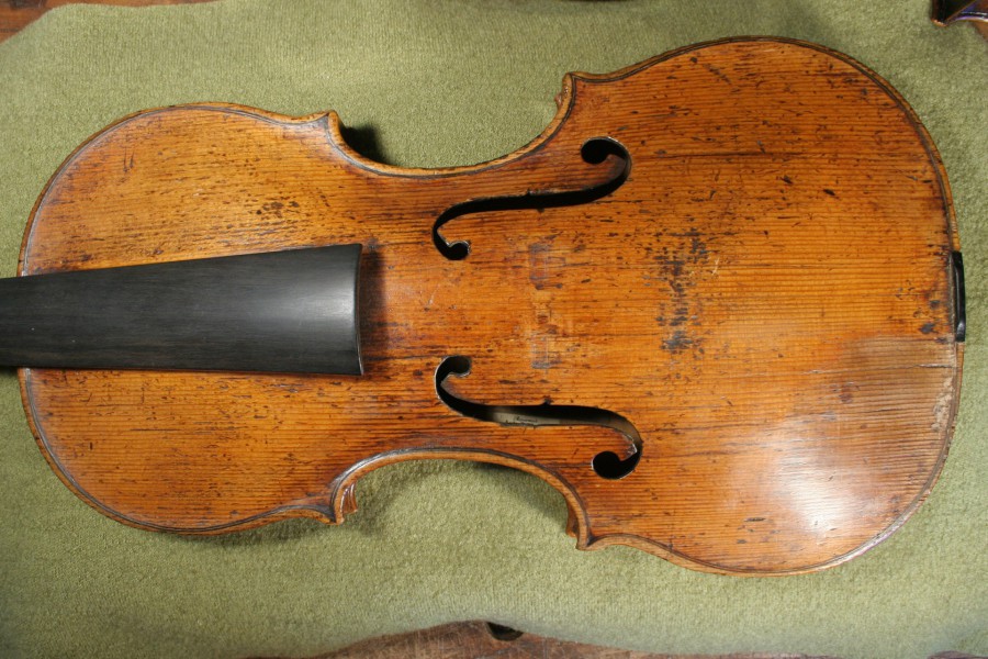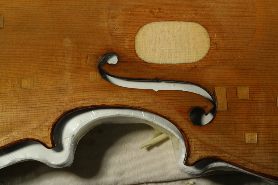 Restaurierung - Geigendecke von Camillo Camilli - Ränder ergänzen, neuer Bassbalken, Risse teiweise neu leimen und belägen. Neues Stimmfuter bei Violine von Pietro Antonio dalla Costa Decke in Gibsbett.