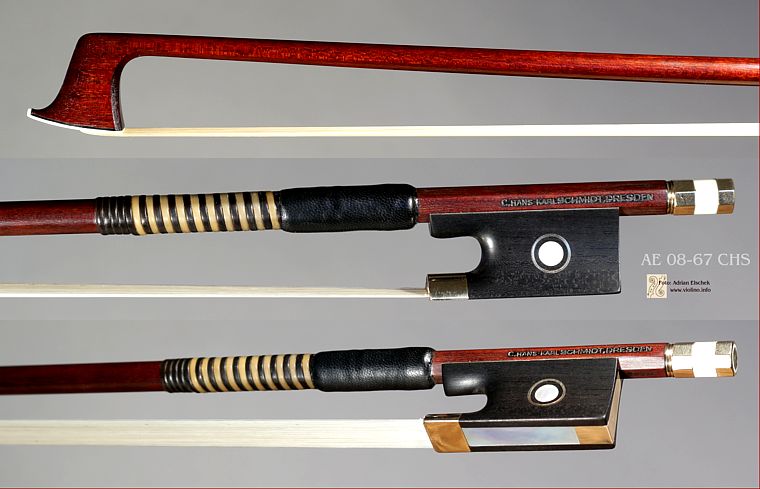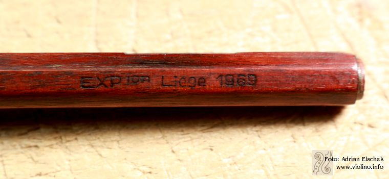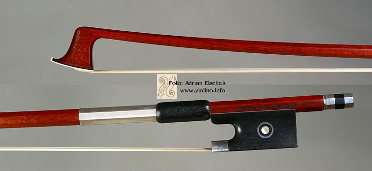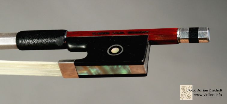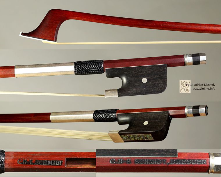 Violinbogen gebaut in Markneukirchen von Bogenmacher Christian Hans-Karl Schmidt (Sondermodel anläslich der Expositon in Liege im Jahre 1969); Achteckige Fernambuckstange, Montiert in Ebenholz / Silber